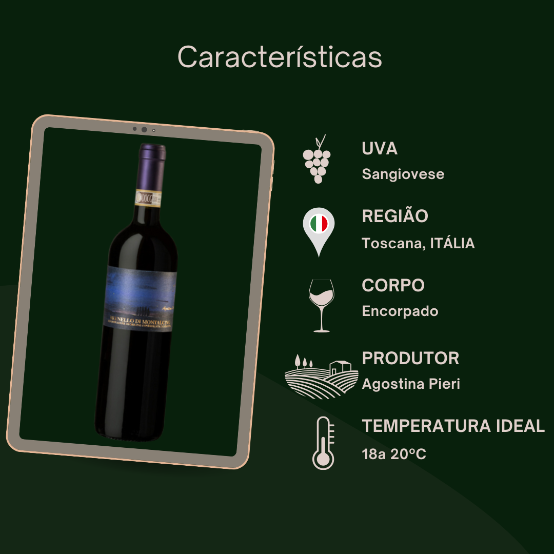 Experimente o luxo do Agostina Pieri - Brunello di Montalcino. Aprecie o sabor do famoso vinho italiano, elaborado com uvas cuidadosamente selecionadas pelas mãos experientes de Agostina Pieri. Descubra a mistura perfeita de tradição, paixão e excelência em cada gole.