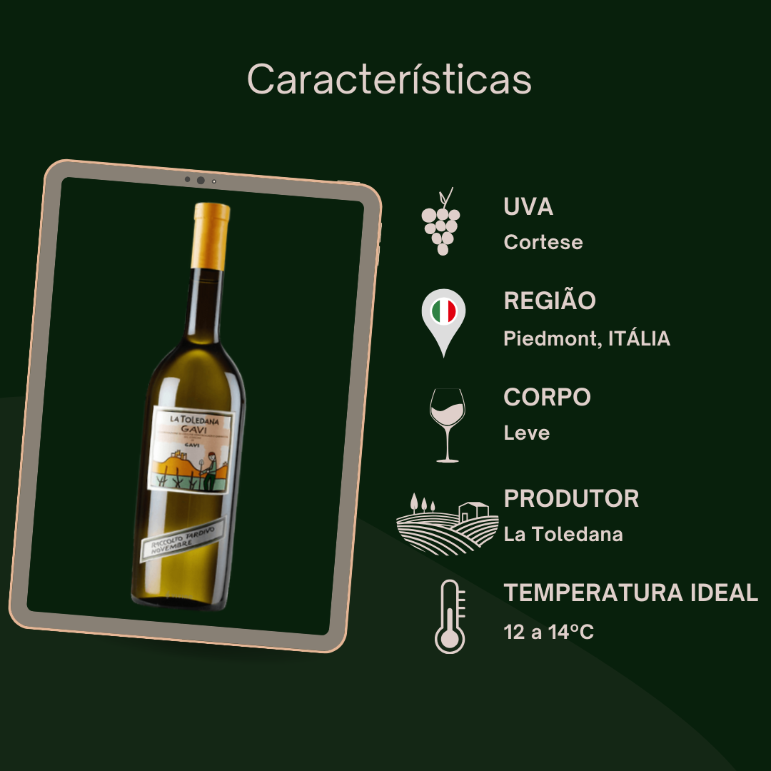Desfrute da elegância e qualidade do La Toledana - Raccolto Tardivo Gavi. Produzido na Itália a partir da uva Cortese, este exclusivo vinho branco oferece um sabor refinado e suave. Surpreenda-se com sua colheita tardia e aprecie o melhor da região de Gavi com La Toledana.