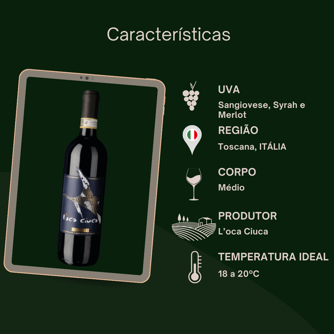 L'oca Ciuca, um vinho tinto único e exclusivo da Toscana, Itália. Produzido em 2020, apresenta o requintado sabor da uva Sangiovese, conhecida por suas notas frutadas e complexas. Uma experiência sensorial luxuosa que combina tradição e inovação.
